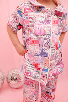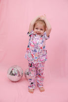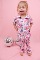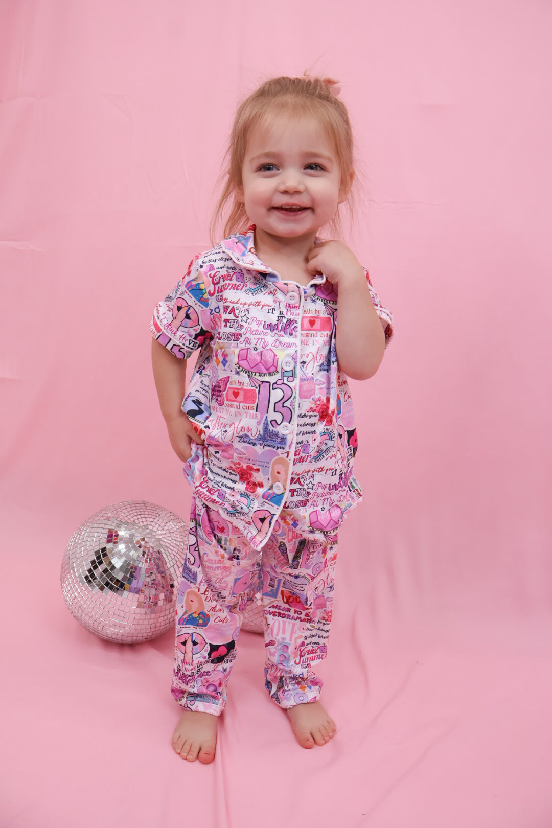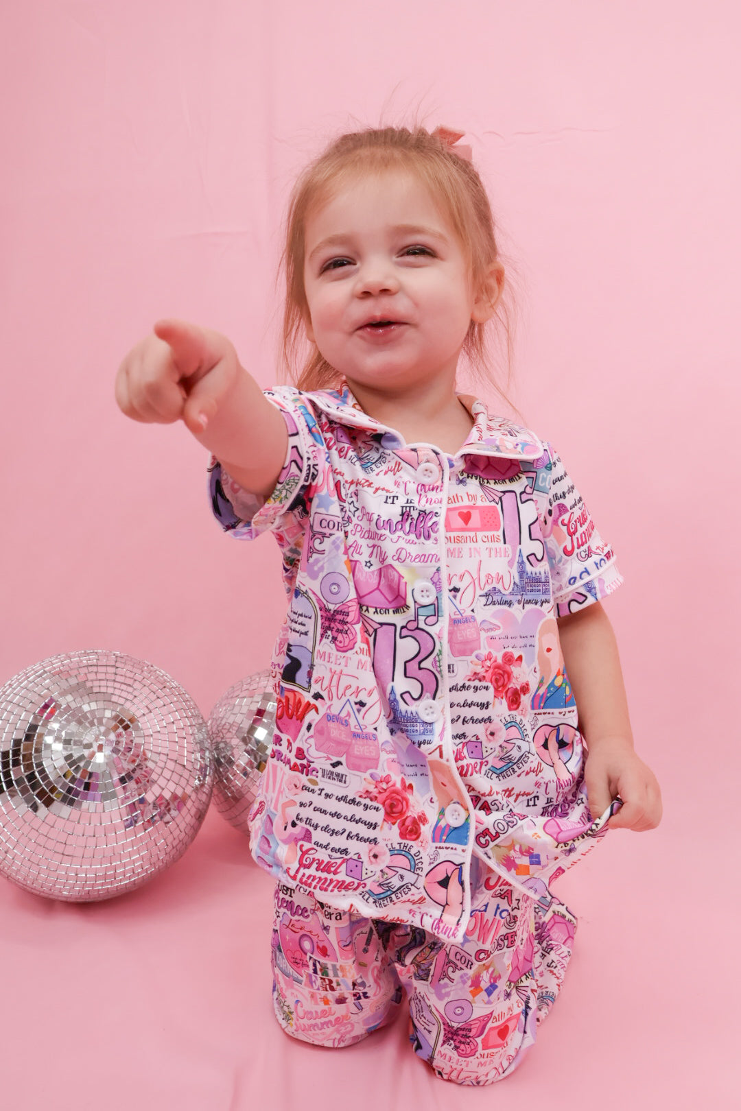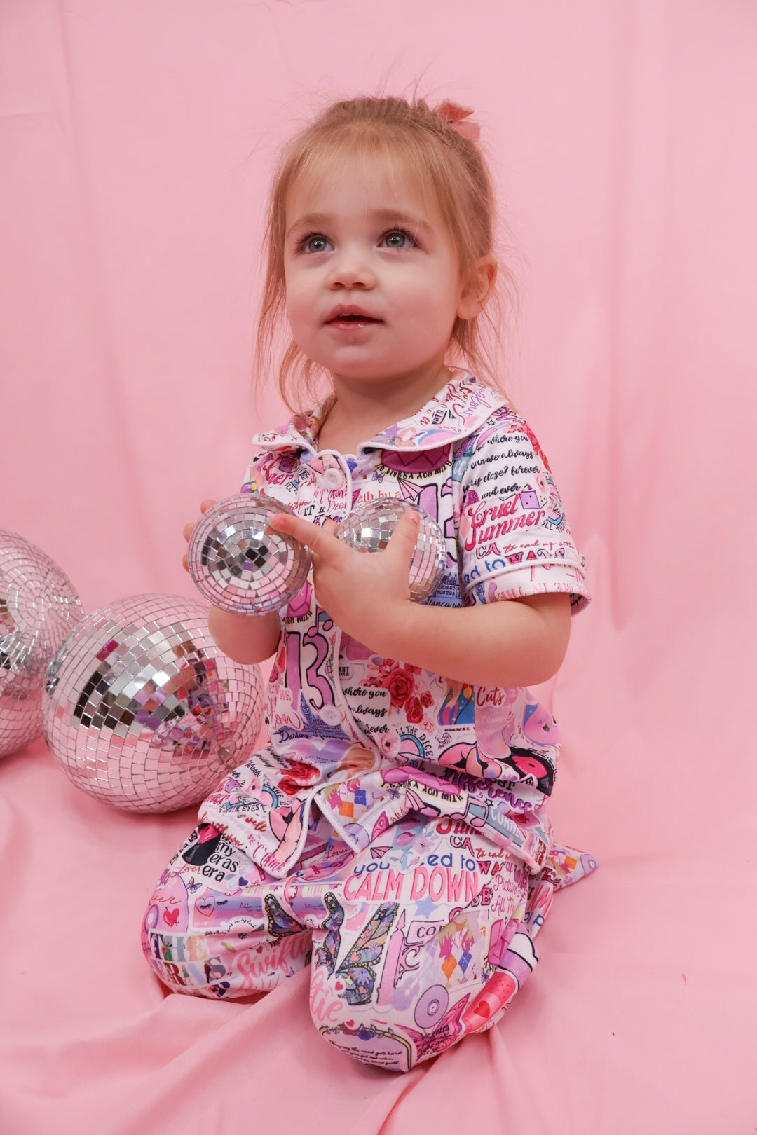 Introducing our Swiftie kids pajamas, the perfect blend of fun and comfort! These pajamas feature a classic button-up top and pants set in a vibrant pink and purple Taylor Swift print. Made with a soft and breathable blend of polyester and spandex, these pajamas are as stylish as they are comfortable. Sleepovers will never be the same!